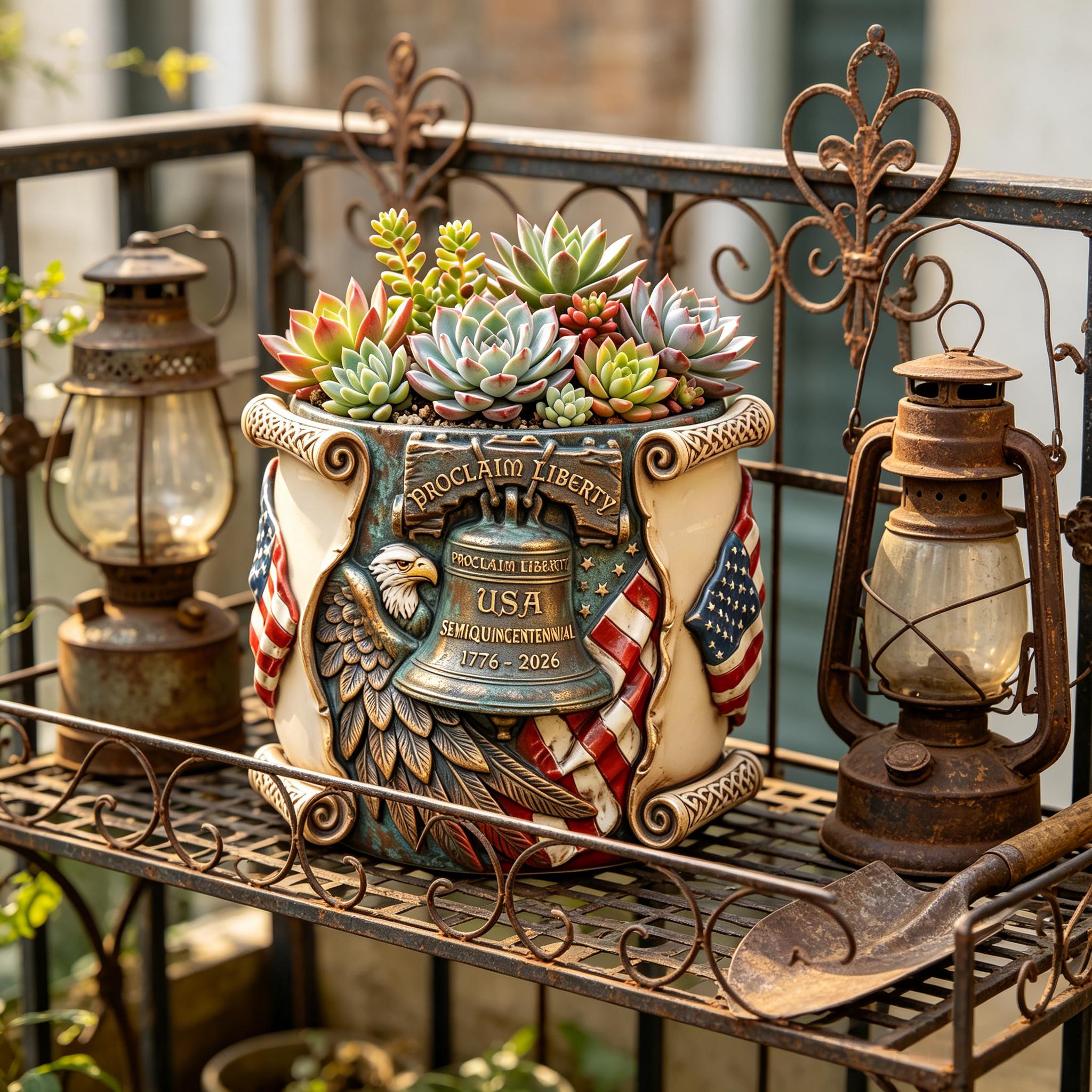 🔥 Honor 250 years of American freedom with this iconic Liberty Bell succulent planter!✨ Crafted with intricate patriotic details, featuring the Liberty Bell, Bald Eagle, and 1776-2026 anniversary branding!