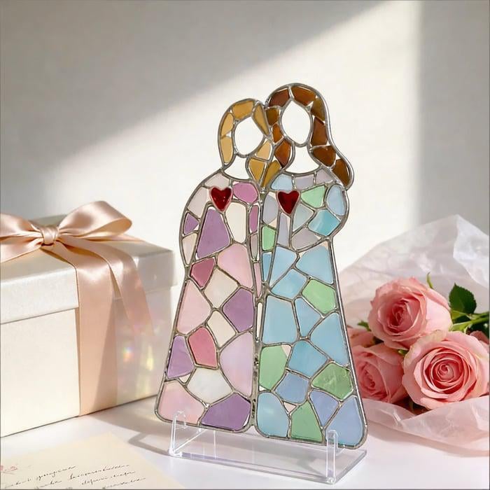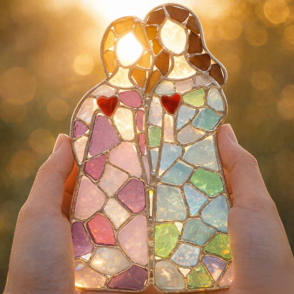 Each piece features soft, frosted sea glass in gentle, iridescent hues, with two loving figures joined by bright red heart accents—capturing the warmth of a mother’s embrace. When sunlight streams through, it glows with dreamy, rainbow light, casting colorful warmth across your home.