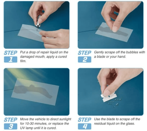 Glass repair kit can be applied to most types of double-layer laminated windshield damaged outer glass, cracks not exceeding 12 inches/30 cm and circular damages not exceeding 1 inch in diameter. It can effectively repair small debris, bullseye, spider webs, star and half crescent shapes.