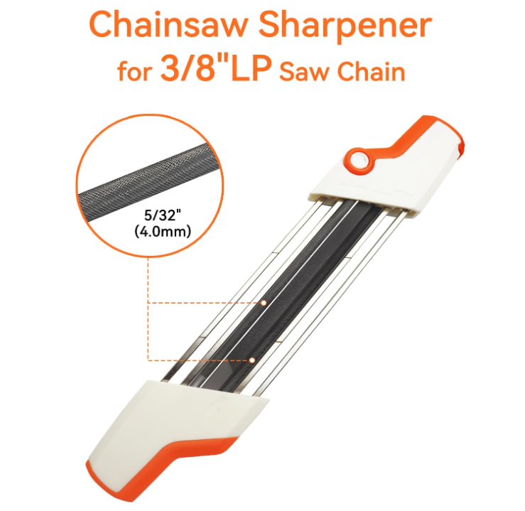 This 2 in 1 chainsaw sharpener round file diameter is 5/32"(4.0mm) for 3/8LP saw chain, with handles at both ends. And without the need to disassemble the saw chain, can help you sharpen saw chain quickly, accurately, and efficiently.It will save you more time and work efficiently.