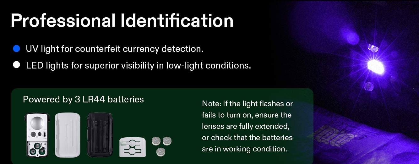 illuminated jewelry loupe has built-in LED light and UV light, powered by 3pcs LR44 batteries; They work well in low light conditions