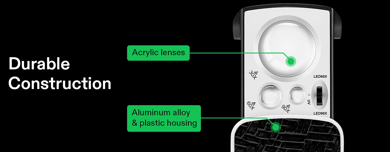 magnifying glass is made of durable aluminum alloy and plastic housing, ABS plastic and acrylic glass lenses,The display is clear and sharp, and the lens is very wear-resistant, which is convenient for you to use for a long time