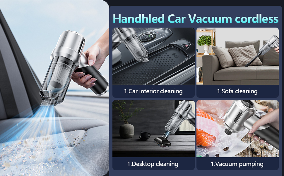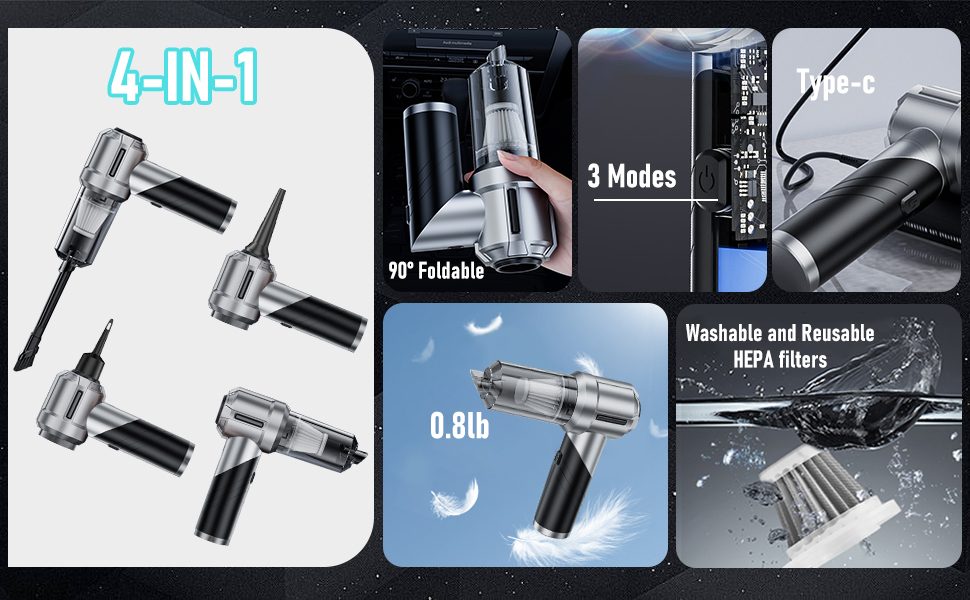 Versatile 4-in-1 Design:Not just a vacuum, this wireless car vacuum for cars comes with a variety of nozzles, allowing you to blow, suck, and inflate for various cleaning and maintenance tasks.