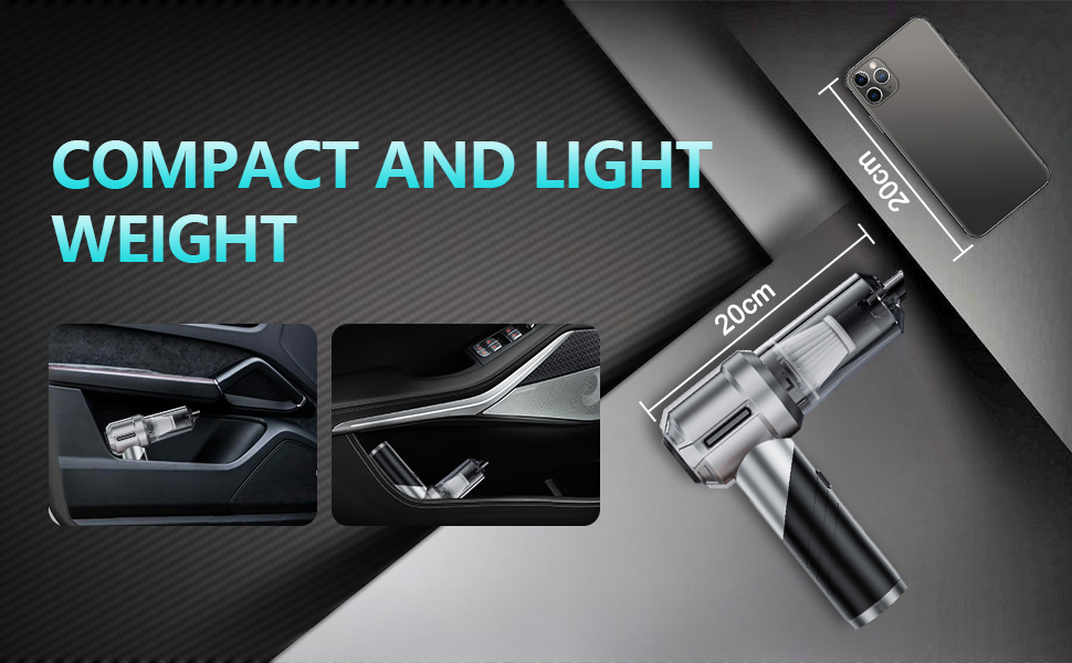 Powerful 20000PA Car Vacuum : This cordless car vacuum cleaner features an upgraded high-speed brushless motor, providing powerful performance.The 3 adjustable suction power modes of 9000PA, 15000PA and 20000PA, With a strong20000PA suction power, this handheld car vacuum allows you to clean pet hair, crumbs, dust, and sand hidden in car seat or sofa.