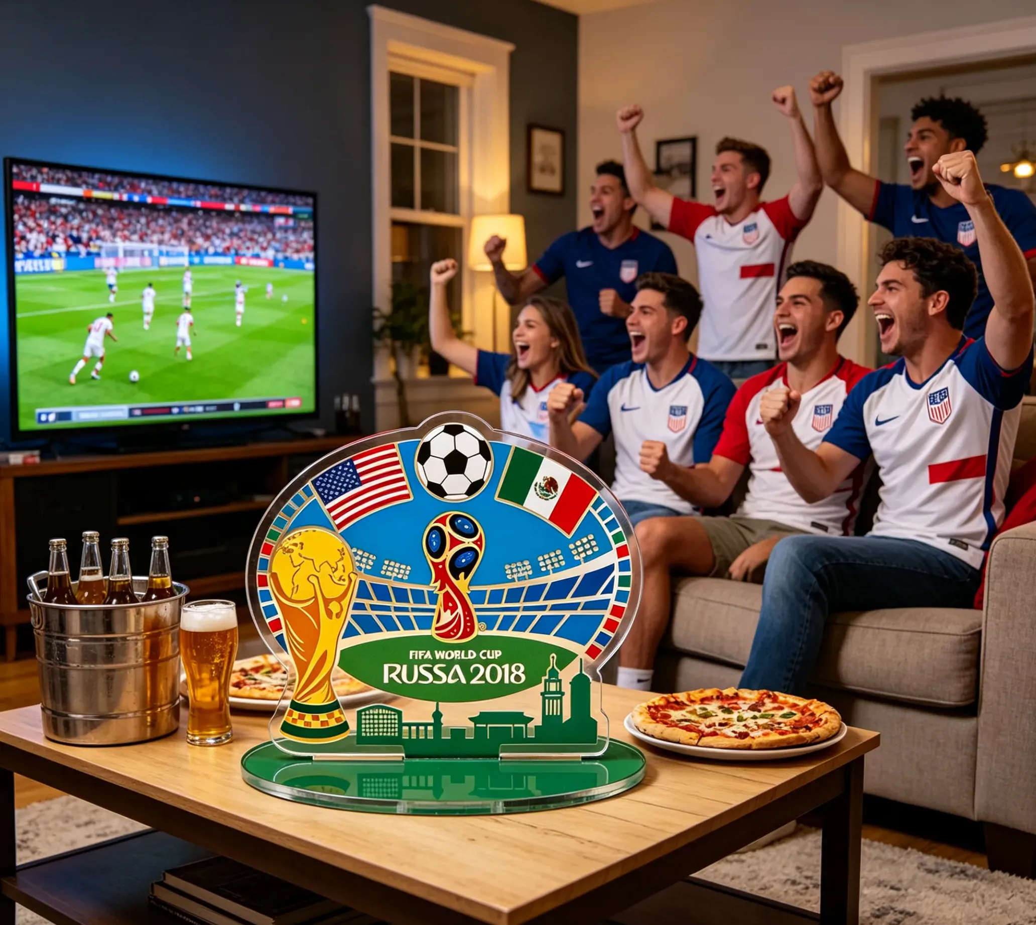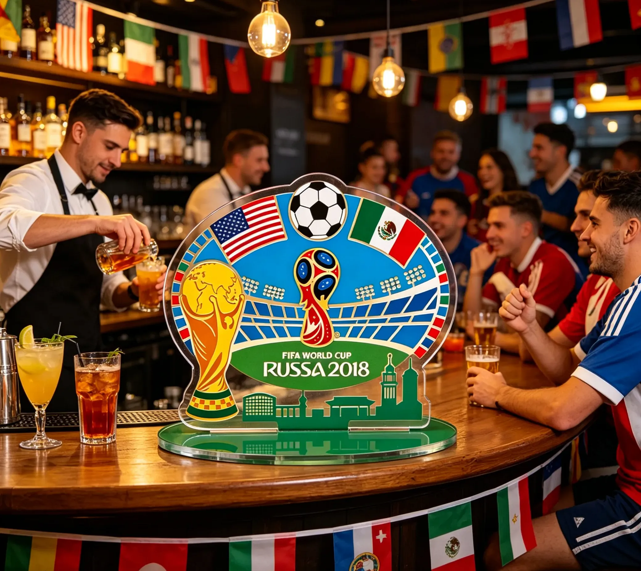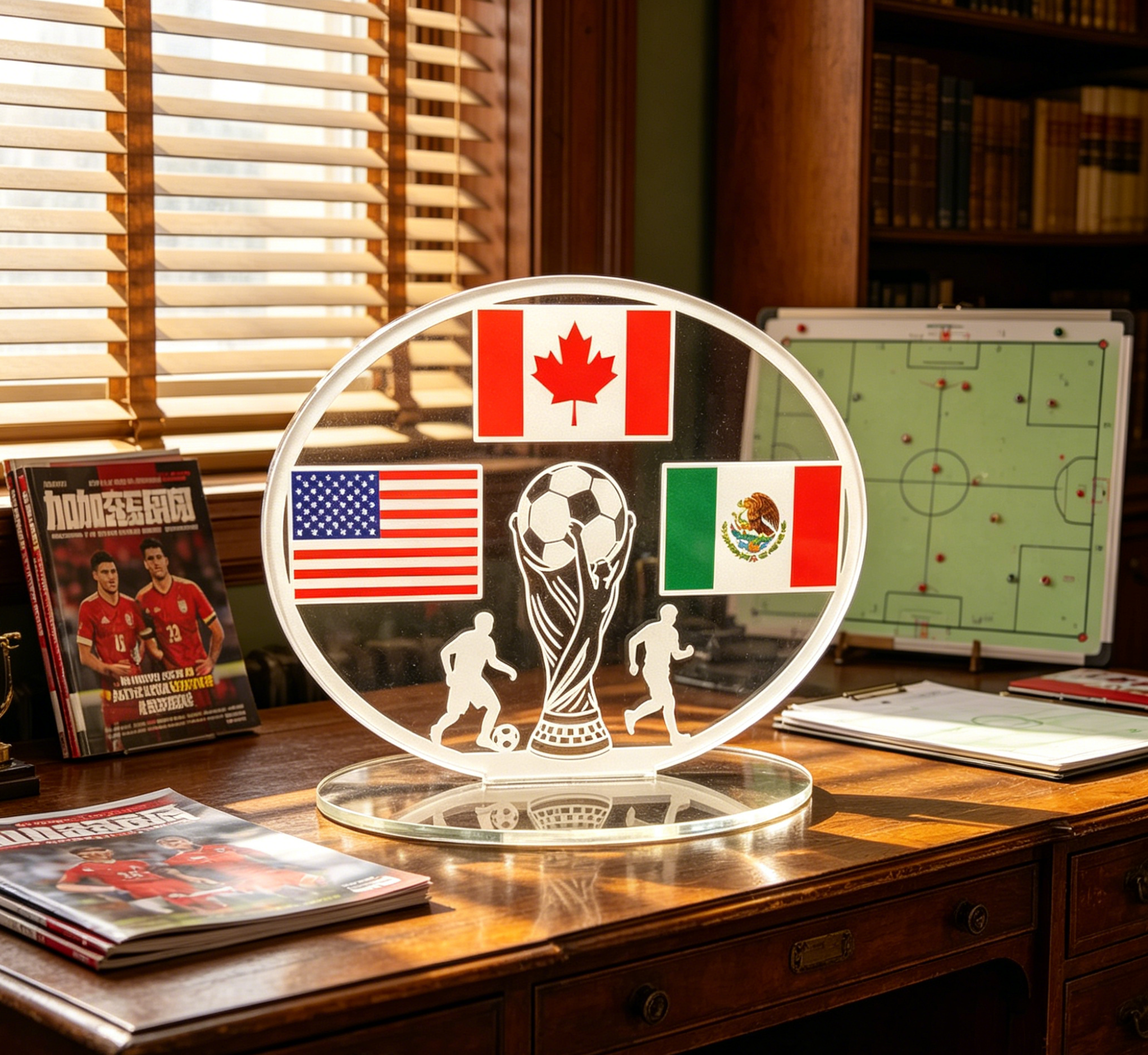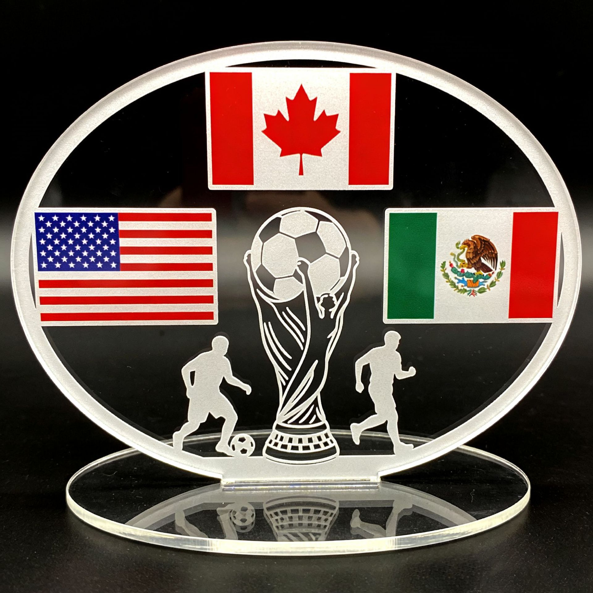 Crafted from high-quality, transparent acrylic, this oval-shaped display features crisp, vivid depictions of the national flags of the USA, Canada, and Mexico arranged around a central soccer ball motif.