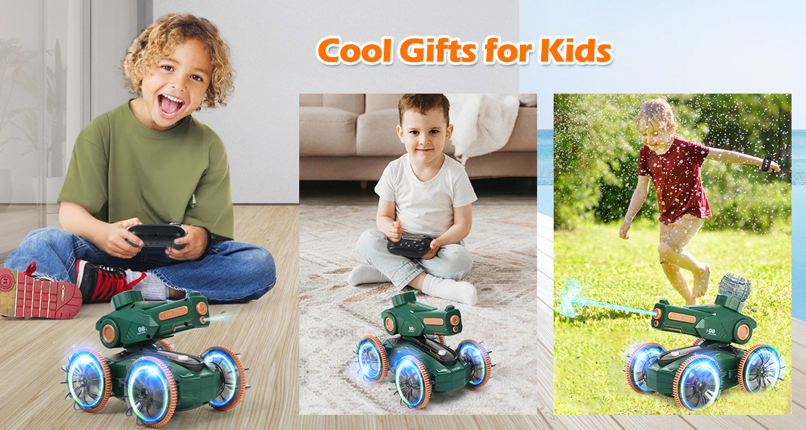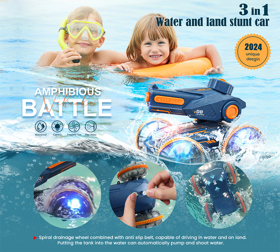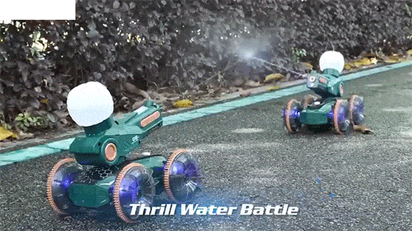 Upgrade Water and Land Fun: Dive into fun with this remote control car tank that effortlessly navigates carpet, lawn, beach, and even pool, lake, bathtub. It transitions seamlessly from land to water, performing 360° spins and thrilling water shooting.