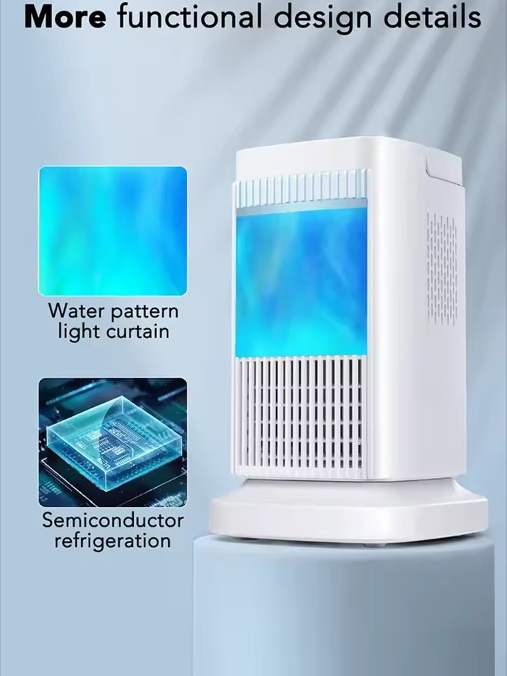 Desktop air conditioner using semiconductor refrigeration technology, with fast cooling speed, high refrigeration efficiency, long life, just plug in the power supply, 10 seconds to blow cold air, no need to add water or ice, saving you the trouble.Fashion water aurora design, with simulation aurora effect, vivid and natural when used, can be used as a night light to clearly see the switch position even in the dark.