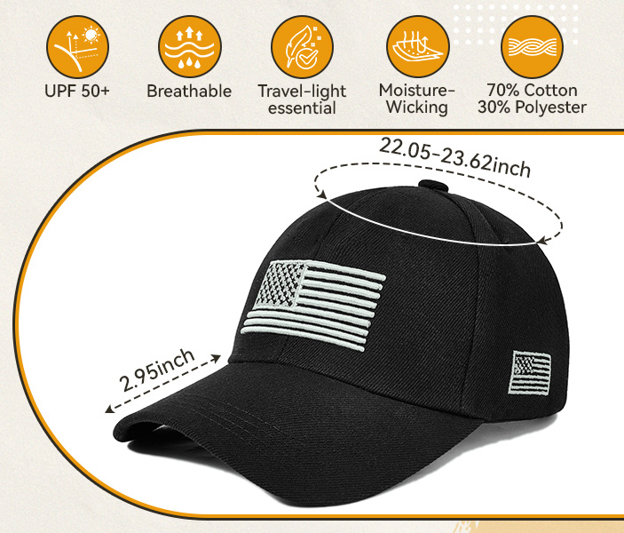 Premium Cotton Comfort – Breathable, Lightweight & All-Day Wear:Made of 70% Cotton 30% Polyester.Crafted from soft cotton with moisture-wicking sweatband and vented eyelets, this low-profile American flag cap keeps your head cool and dry—ideal for summer hikes, daily wear, or workouts.