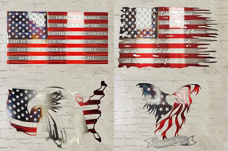 The perfect gift for yourself or any other true American! Each flag is meticulously handcrafted using the latest in CNC Fiber Laser technology. The stars are heat treated with oxyacetylene assuring that no two pieces are identical. The color is achieved with a transparent red powder coat and a glossy layer of clear for ultimate protection!