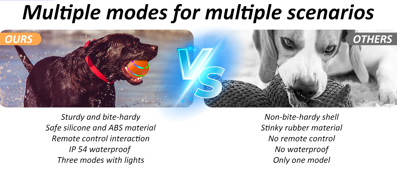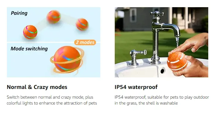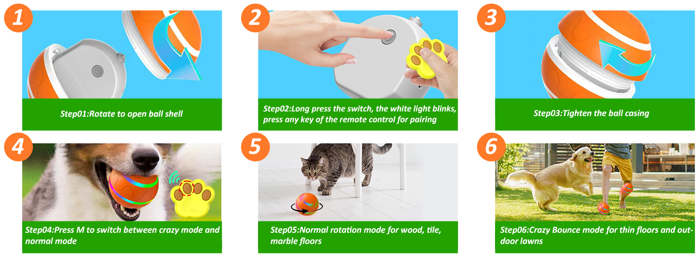 Multiple Interactive Modes: Interactive dog toys with crazy bouncing and normal modes, remote control for forward/reverse rotation. Preset mode when the button is turned on. Colourful LED flashes, the bouncing ball will bounce and rotate for 10s to stop, then the colourful light flashes for 4s to standby. Activated when the dog touches it again. Please read the instruction before use and make sure it is switched off after use.
