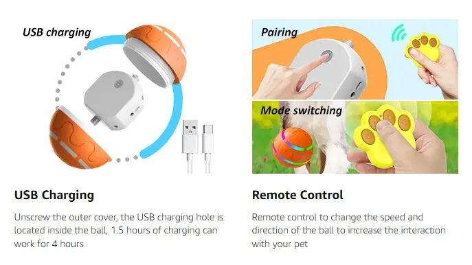 USB Rechargeable: The dog bouncing ball has a built-in 500mAh battery, the red light will flash when low battery, please use the equipped charging cable for easy charging, the electric dog ball toy can provide 1 to 4 hours of play time on a simple charge. A full charge takes about 2 hours.