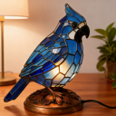 This bright yellow stained bird lamp is particularly eye-catching. Its wings are accented with blue, adding a vibrant touch. The antique base adds a touch of classic charm. It will add a warm, artistic touch to any space.