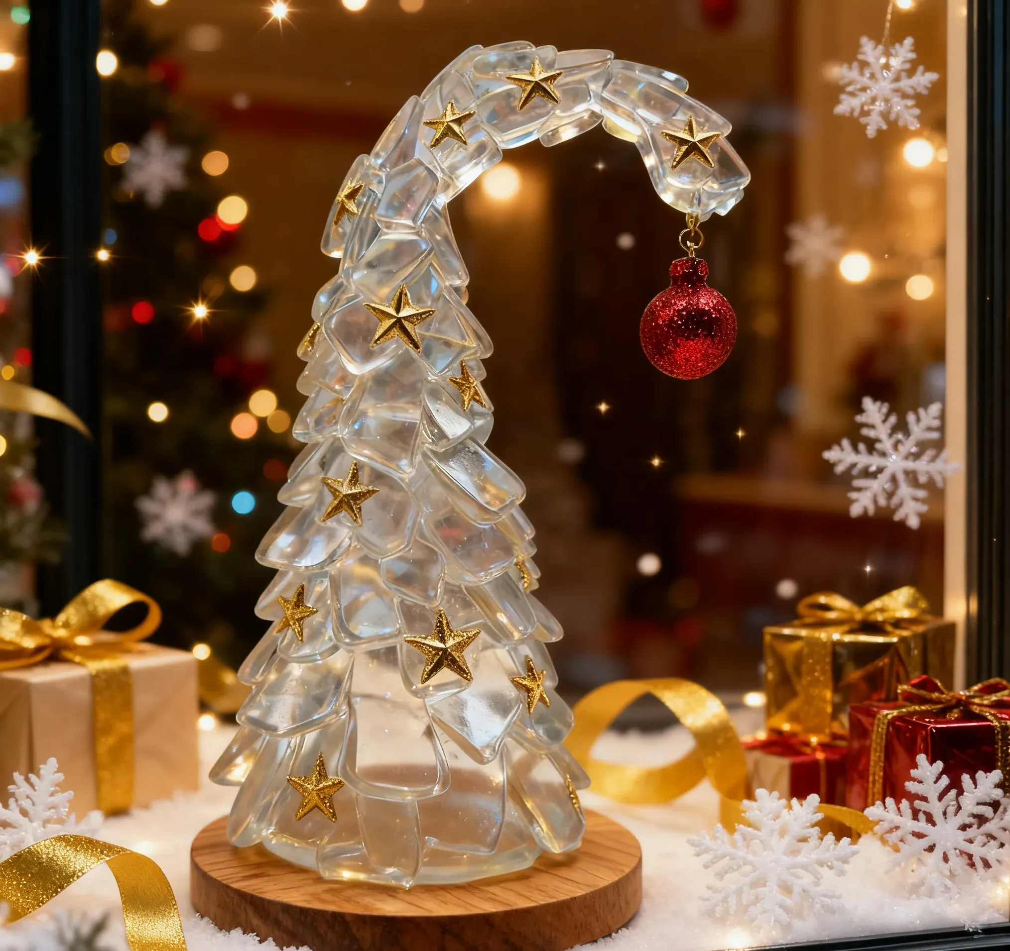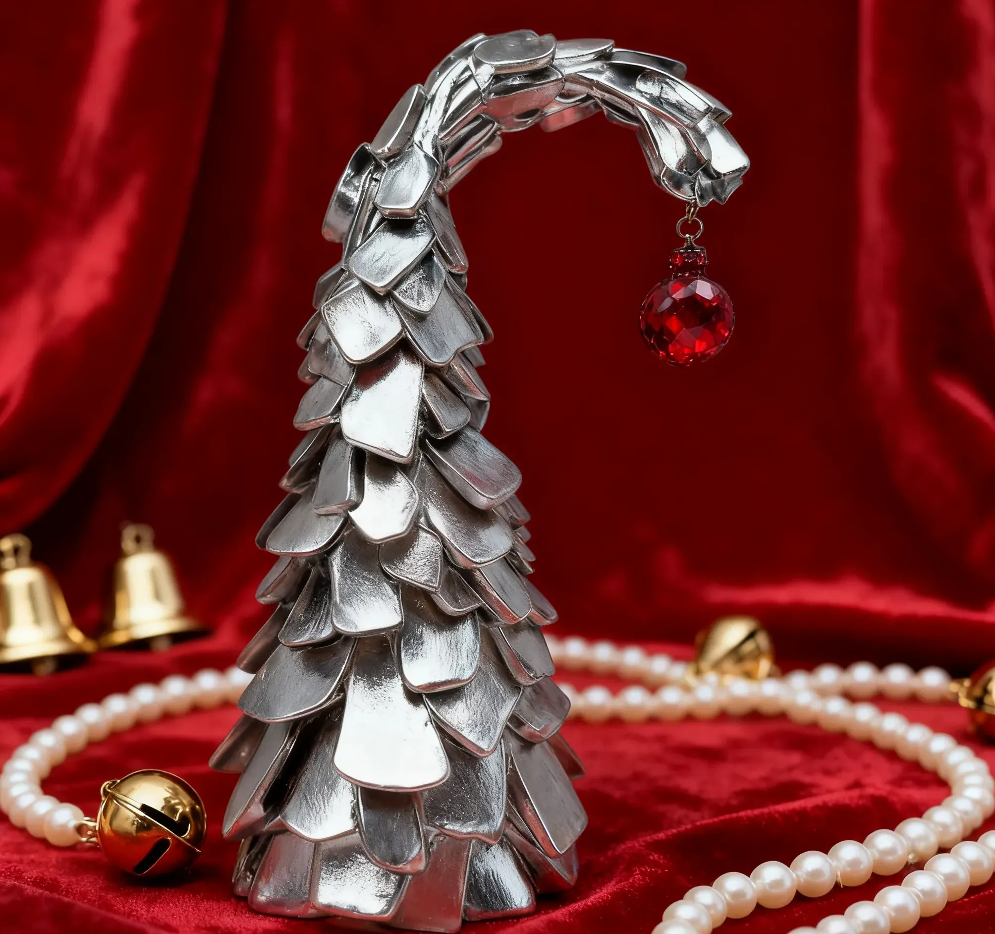A faceted red crystal ball hangs from the curved treetop. The contrast of red and silver creates a striking visual impact. While preserving the classic Christmas color scheme, the contrast of metal and crystal creates a touch of luxurious artistry. The overall design breaks the stereotype of the traditional Christmas tree, creating a unique and eye-catching art installation.
