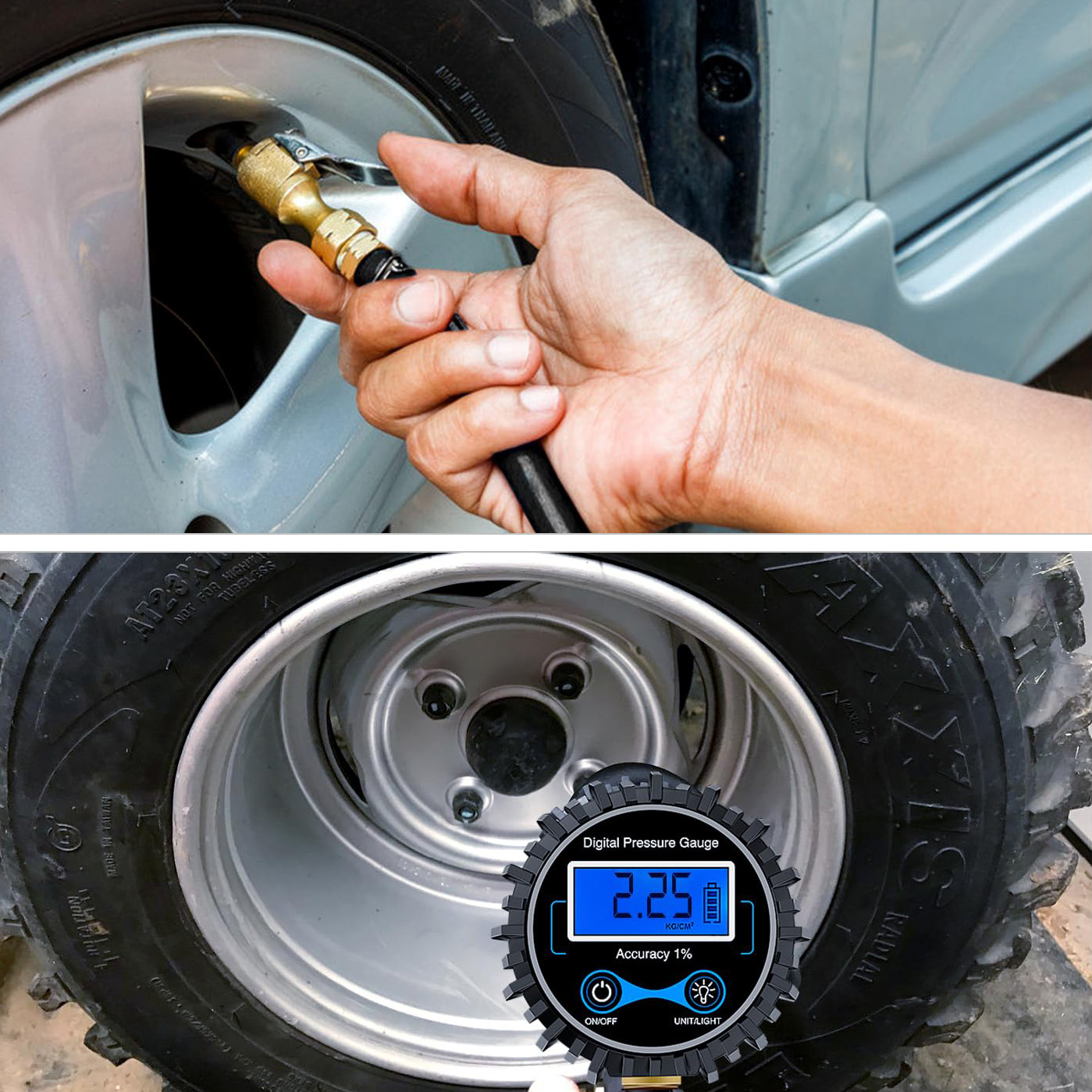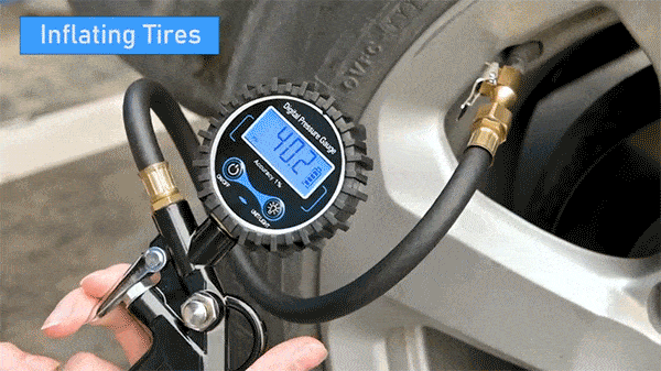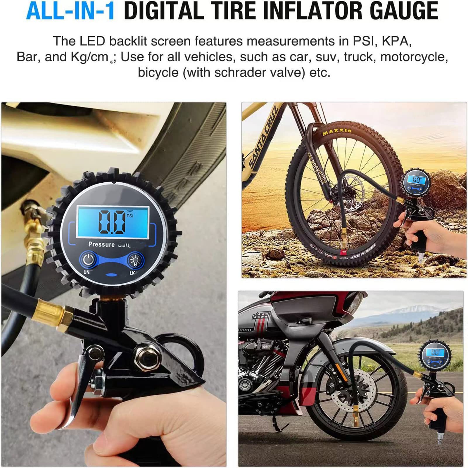 AstroAI tire pressure gauge Includes an inflator, straight locking chuck, gauge, hose, and bleed valve, all in one unit with function of deflation, inflation, tire pressure check. Compatible with both ¼” and ½” NPT air compressors outputs.
