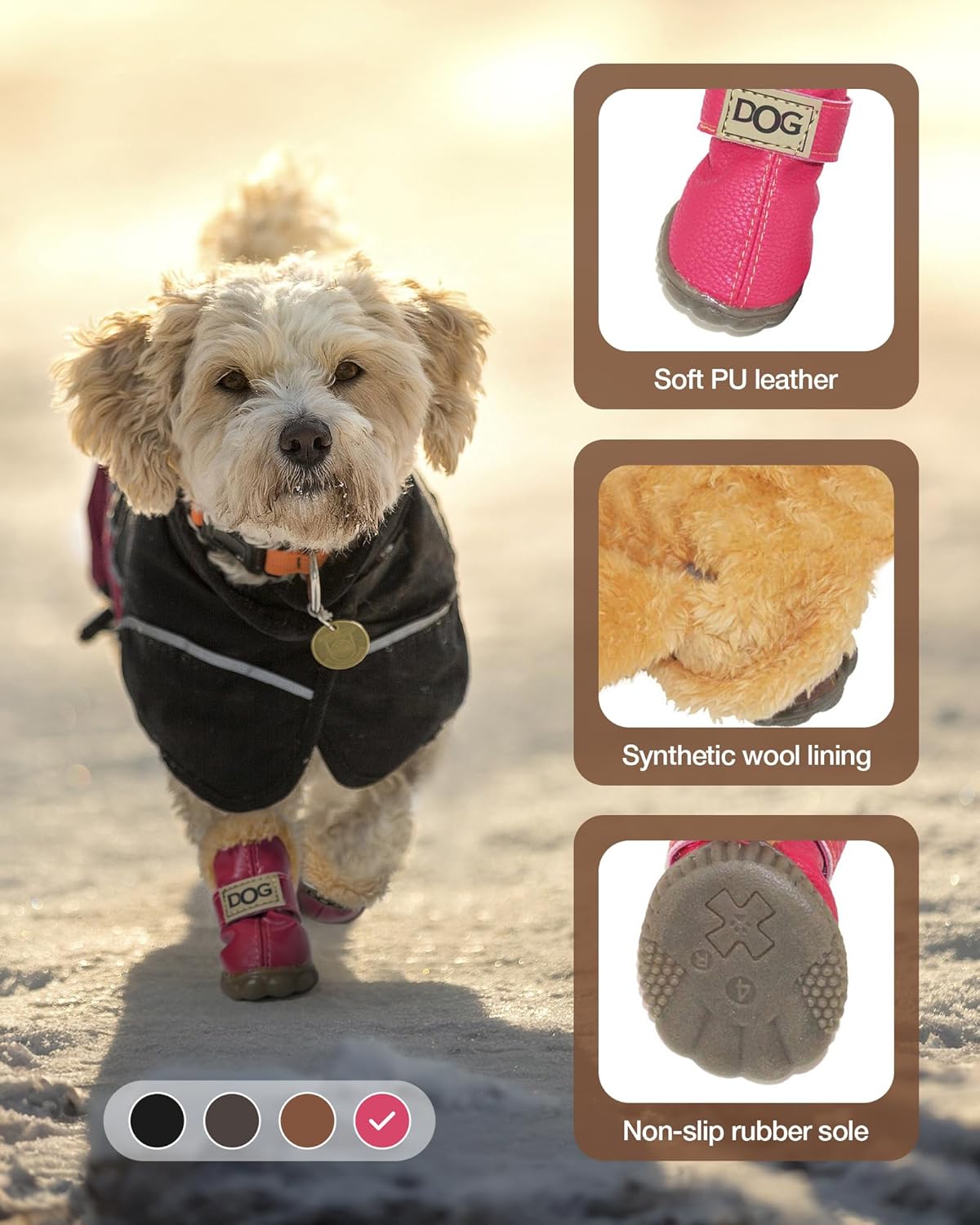 4 Pack shoes sold together, made of soft PU leather material, anti-slip rubber soles let your puppy moves freely and safely in outside/inside activities, durable paw protectors can keep them warm, dry and comfort in cold weather.