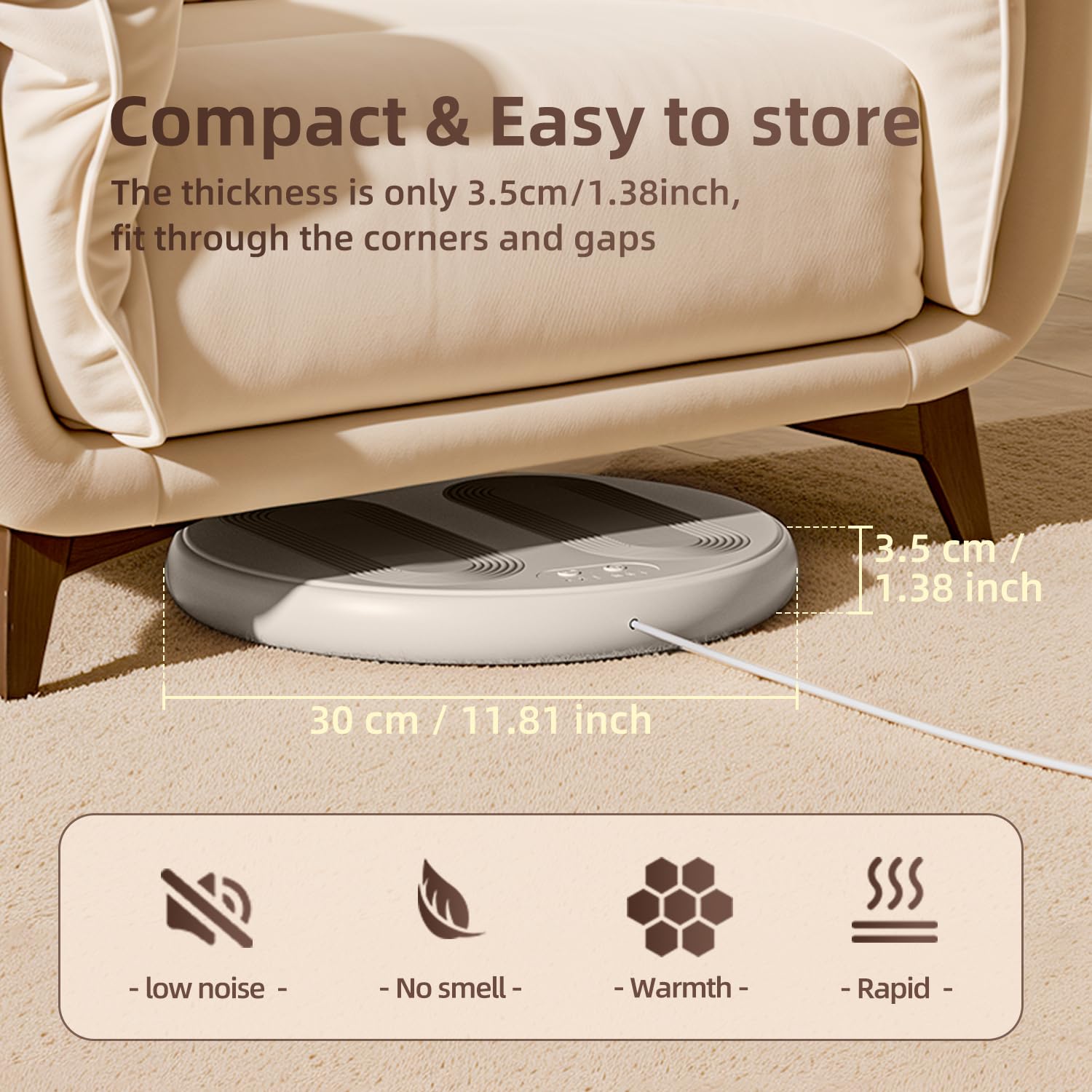 Compact & Easy to Store: Designed with portability, this foot warmer under desk measures just 30cm/11.81 inches in length and 3.5cm/1.38 inches in thickness. Its slim, lightweight design fits neatly under furniture or in small spaces, offering quiet warmth without light or noise distractions