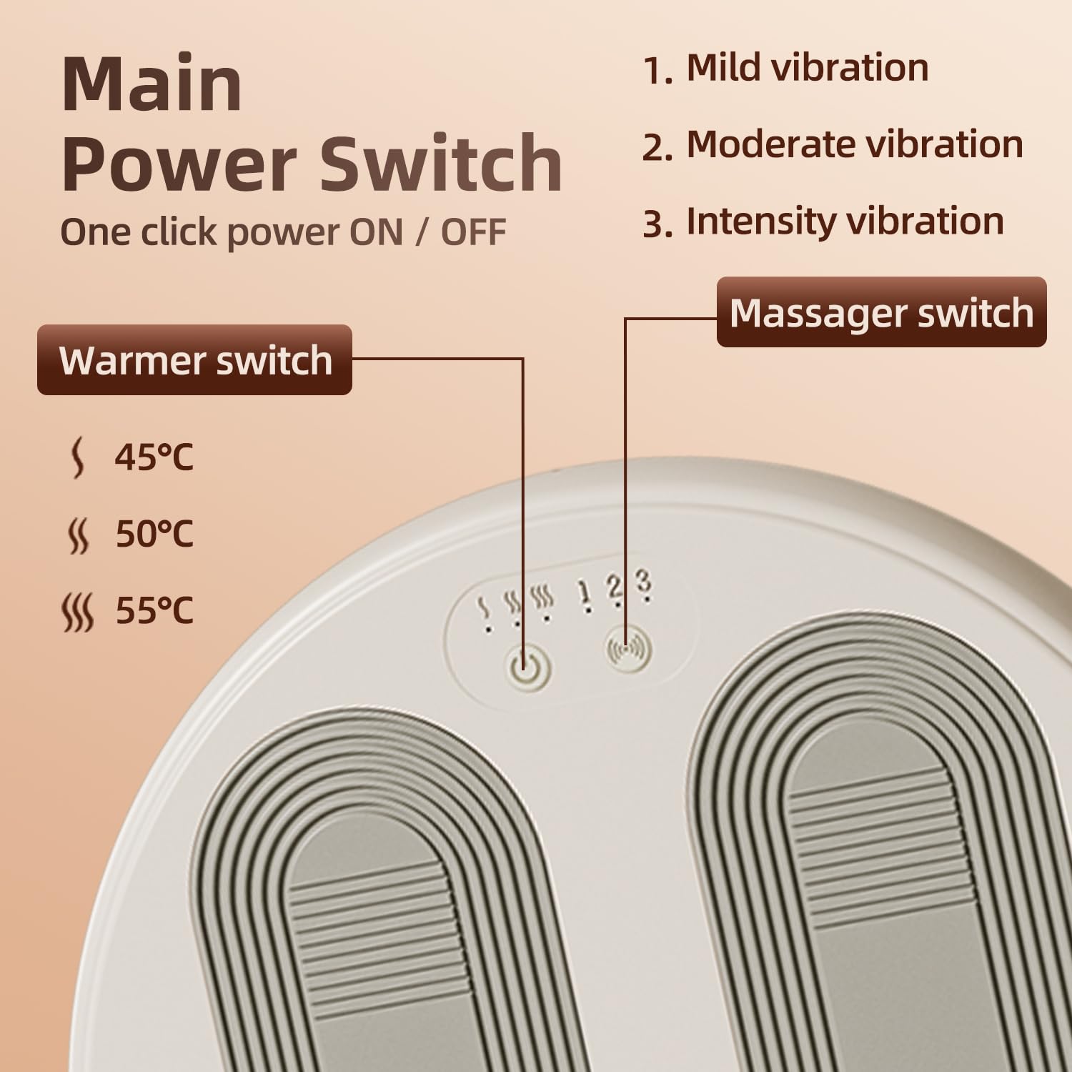 Easy Setup: Easily adjust to your preference with 3 heating levels and 3 vibration modes. The intuitive design features dual control buttons that can be operated by foot, making it effortless to set your desired warmth and massage intensity