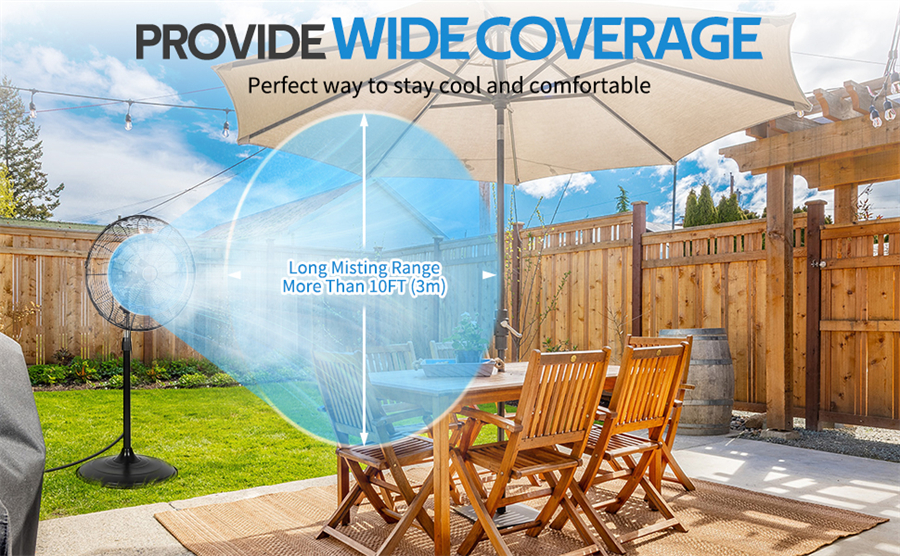 Cool the surrounding area up to 68℉. Fan misting is a must-have accessory for anyone looking to stay cool and refreshed during hot summer days. With its instant and refreshing mist, you, your loved ones, and even your pets can enjoy a refreshing breeze even in the hottest temperatures.