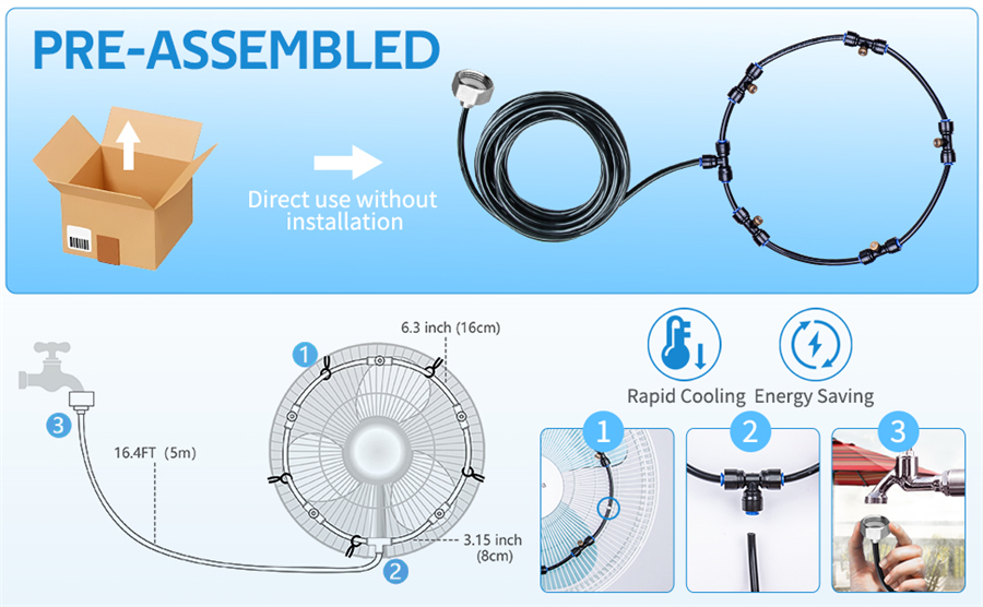 Our fan misting system is preassembled and comes with everything you need to get started. Simply attach the misting ring to your fan and connect the tubing to the water source. It matches with garden connectors that have a 3/4'' standard adapter, such as an outdoor faucet, hose splitter, garden filter, garden timer, or spray nozzle. It's that easy!