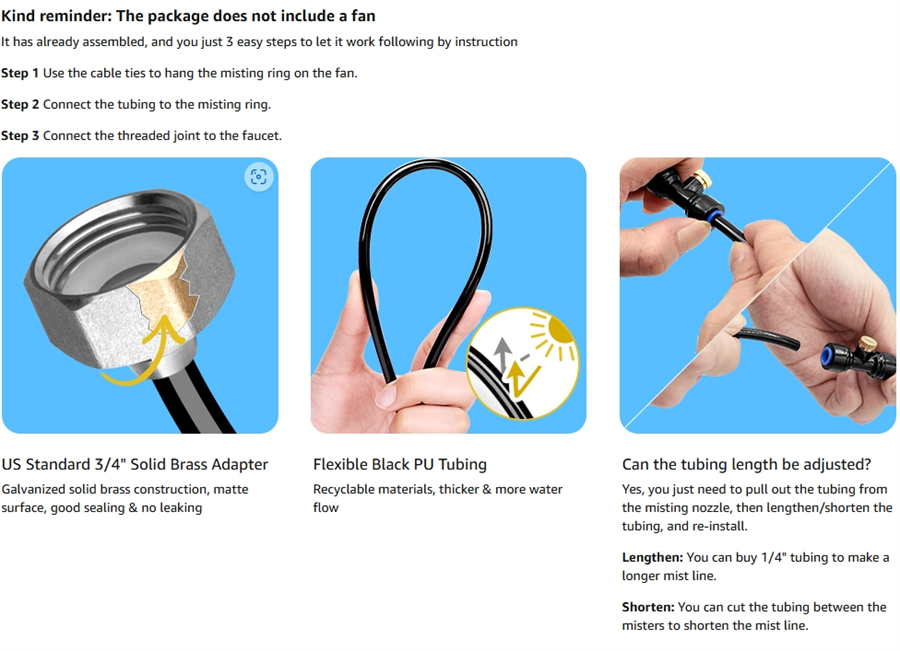 Our 2024 new upgrade fan misting system is made from high-quality materials to ensure durability, no leaking, and long-lasting performance. The tubing is UV-resistant, and the misting nozzles are made from brass for added durability.