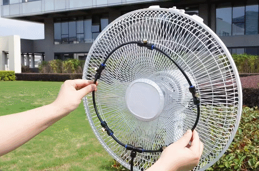 It is easy to install, simply zip tie it to your fan cage in the center. The tubing is push lock, so simply slide the tubing in to the control valve and the control valve into the misting ring and installation is complete. If you are using an oscillating fan, be sure to leave some slack in the line so it can move. If you are having a gathering or are sitting outside, it is best to position the fan 20-30 feet away, upwind and allow the fan to blow across the breeze that is already heading towards you.
