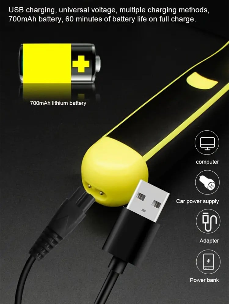 USB charging, built-in 700mha battery, can run for 60 minutes when fully charged, solving the problem of short battery life; adopts universal voltage and multiple charging methods, such as: computer, car power supply, adapter and power bank, etc.