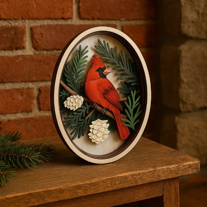 A vivid red cardinal perches on pine branches, framed by dainty pinecones.