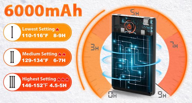 The rechargeable heated socks are equipped with a 6000 mAh large-capacity battery,supporting up to 5-9 hours of warming.Lightweight and thin design make the battery fit completely into the socks.You can easily turn on/off or adjust temps using large side buttons on the battery even without your phone.Clear power and temperature indicator lights let you know the battery status as well. It usually takes 3.5-5 Hours to fully charge