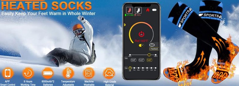 Newly added remaining usage time estimation and charge status display function can clearly show the heated socks situation, preparing you for your adventures. The temperature of heat socks can be adjusted to any temperature between 95 ℉ and 158 ℉ via the APP. The heated socks can also automatically turn off with a timer. Note: Remaining usage time will change dynamically based on the environment and the condition of the battery