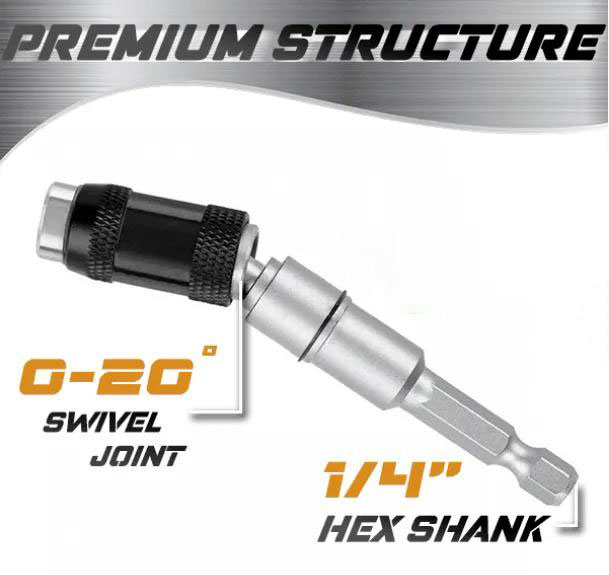 The magnetic swiveling bit tip holder has a swiveling ball head for installing screws with a portable electric drill even in inaccessible places where the drill chuck of the machine would be an obstacle. It can be swiveled up to 20 degrees to drive either straight or at an angle. Fits perfectly in tight spaces and corners.
