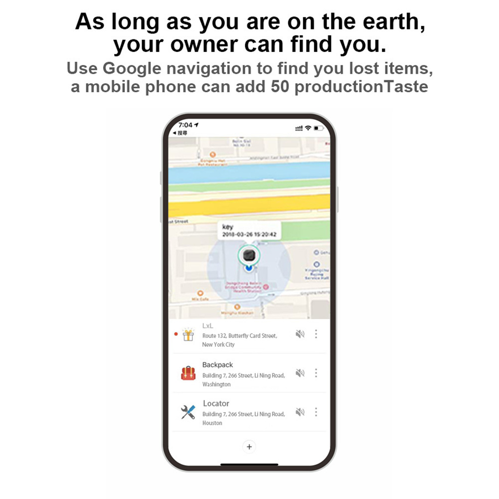 3. Global positioning function: The locator will send out a safe Bluetooth-compatible signal every two seconds, so that the surrounding Apple devices can detect and receive this signal and upload and share it to the for IOS ICOUD server. The owner can know the location of Findmytag through the APP software, Navigable to find items, let you find things worry-free.