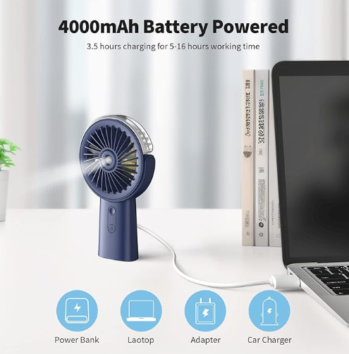 With 4000mAh rechargeable battery operated, our portable mist fan runs more than 6-15 hours depending on different wind speed. Are you still worried about the trouble or embarrassment when your phone is out of power? This mister fan can serve as a convenient emergency power.