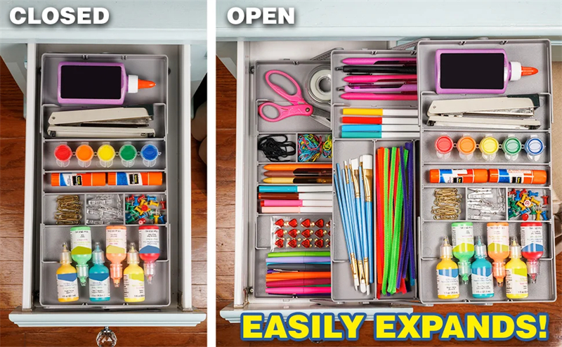 Smart Drawer adjusts to fit inside almost any drawer. Great for organizing, cosmetics, jewelry, kitchen, office, junk drawer, workshop, and more!