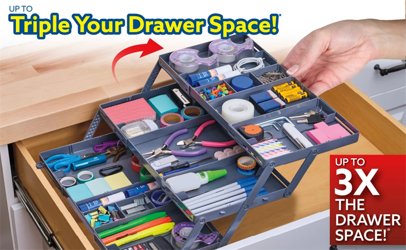 Smart Drawer has three tiers that are compact when closed and easily opens and expands to organize and maximize space in virtually any drawer.