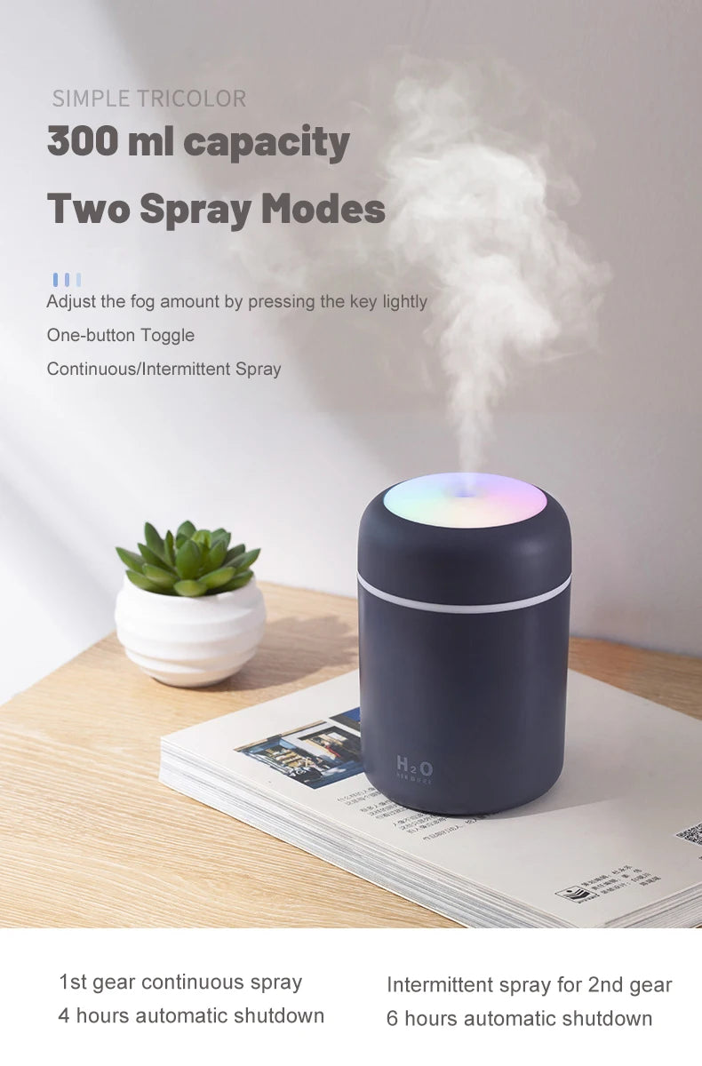 Elevate the ambiance of your space with the USB Cool Mist Sprayer Portable Air Humidifier and Aroma Oil Diffuser.
