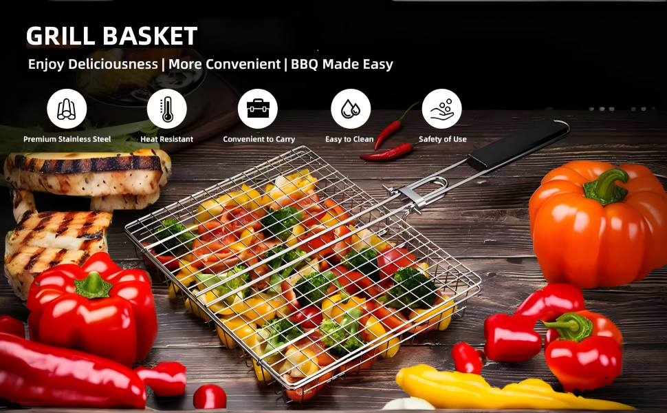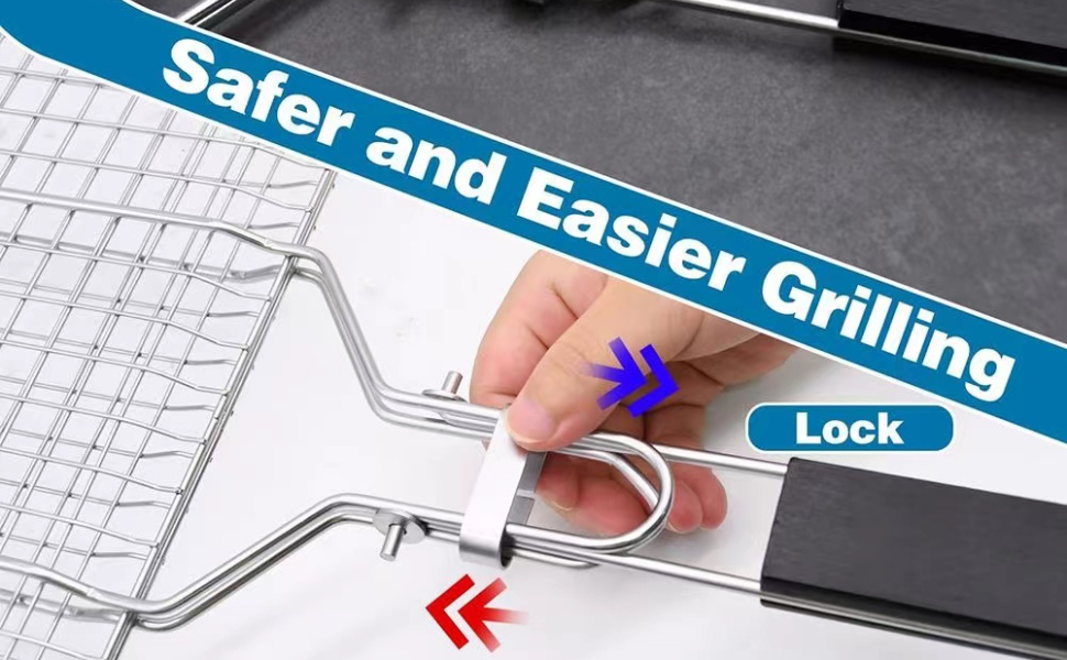 🔥【Secure Locking Mechanism】 - Our BBQ veggie grilling basket is equipped with a pinch latch that securely locks the food inside, ensuring it stays in place and cooks evenly. This feature prevents food from falling through the grill grate, making your cooking process smoother and safer.