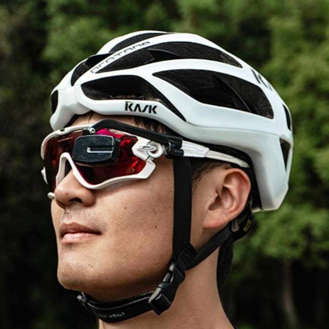 Our product is both perfect for glasses or a helmet. It uses a special mounting mechanism to mount any any cycling sunglasses and also comes with super strong 3M double sided tape to mount on helmets!