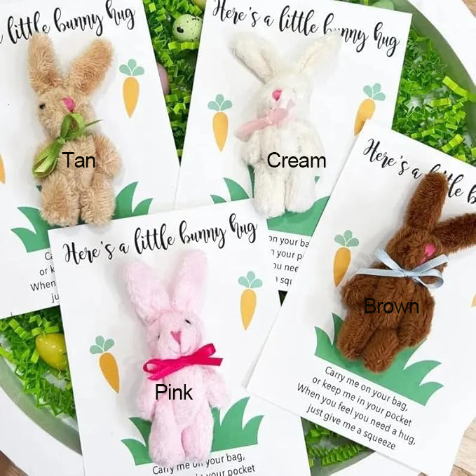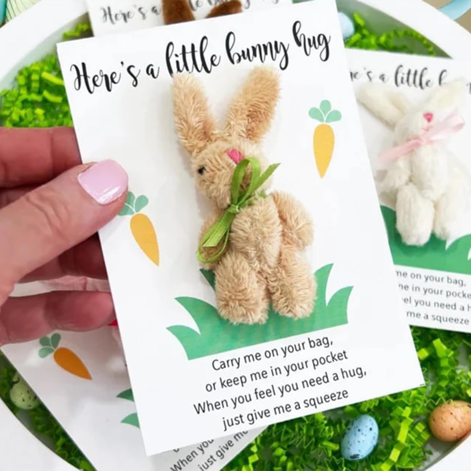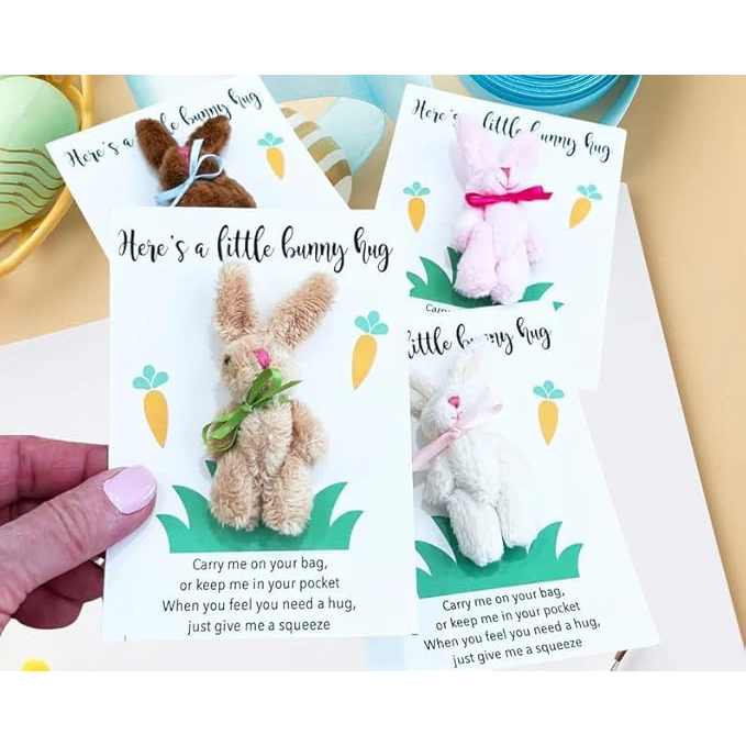 Each palm-sized bunny comes attached to a card with the message: “Here’s a little bunny hug… When you need me, just squeeze!” Slip it into a purse, pocket, or pencil case for on-the-go emotional support.