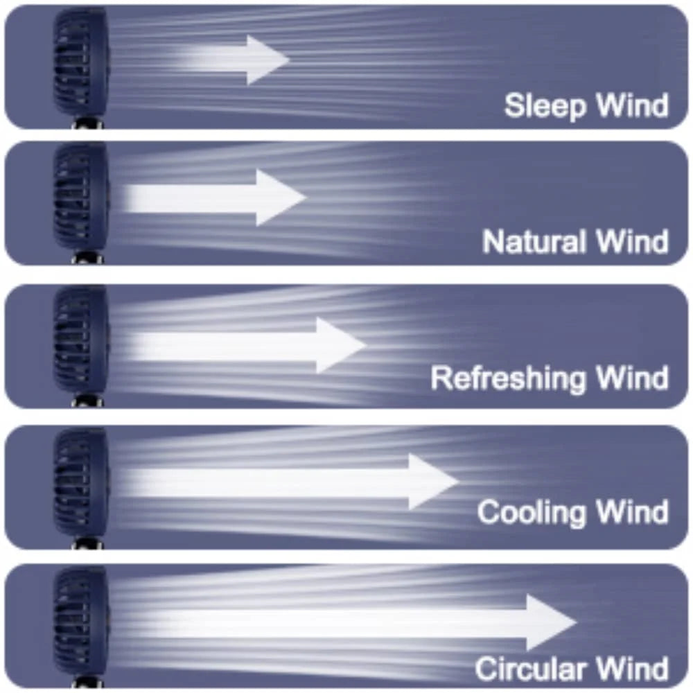 【5 Adjustable Wind Speeds】Offers 5 different wind speeds, with the lowest setting creating a gentle breeze and the highest setting simulating a hurricane. You can control the sleep wind/natural wind/cold wind/hurricane/circulation wind as you wish.