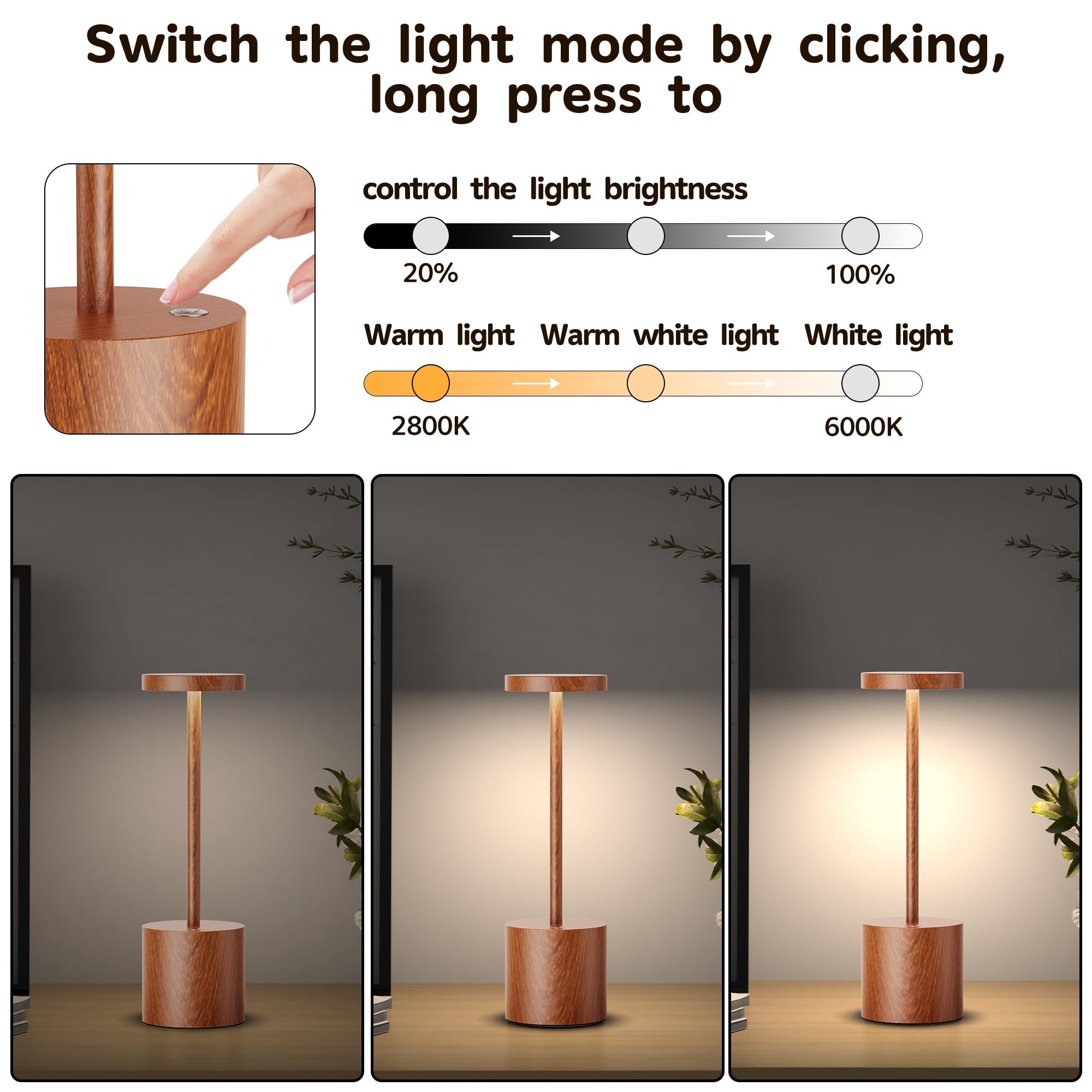 【 Stepless Dimmable Lamp】:The cordless lamp button is dimmer with 3 color of brightness (White Natural Warm) which make it easy for you to change the brightness by tapping the lamp.long press to control the light brightness stepless Dimming(100%-20%). You can set the maximum and minimum color brightness according to the needs of your different scenes.