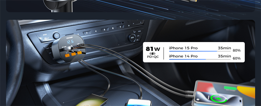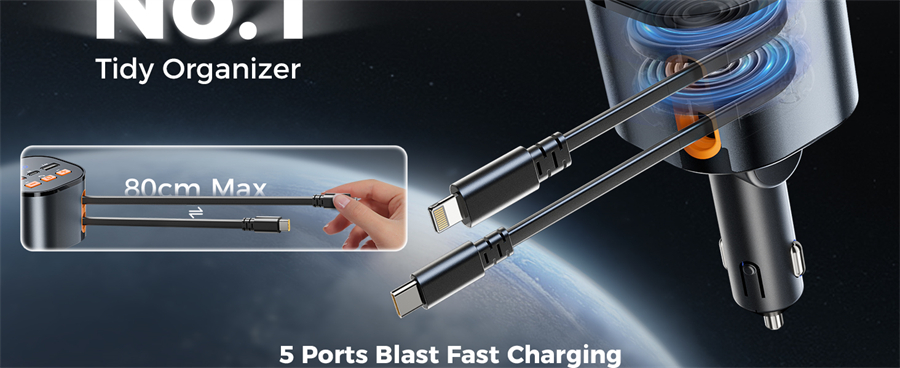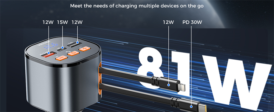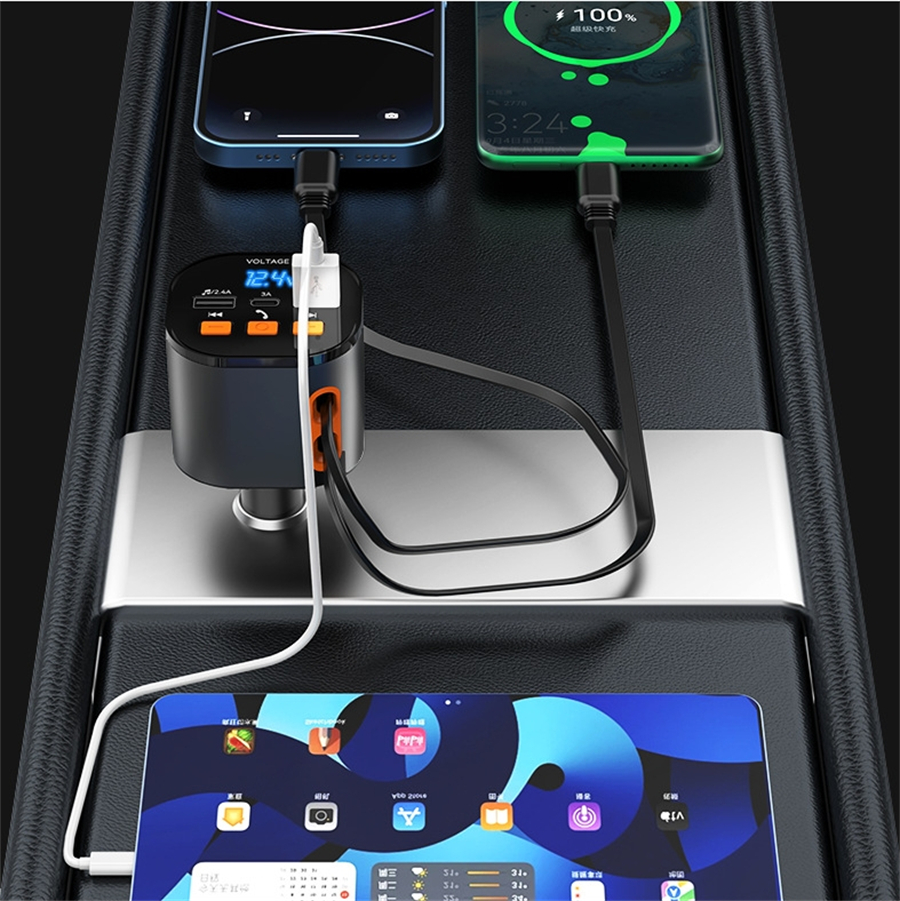 The SUPERONE 81W Bluetooth Transmitter with multi port, with its PD 30W USB C and 12W USB Lightning retractable cables, alongside a 15W USB C and two 12W USB A port, delivers high-efficiency charging for five devices simultaneously.