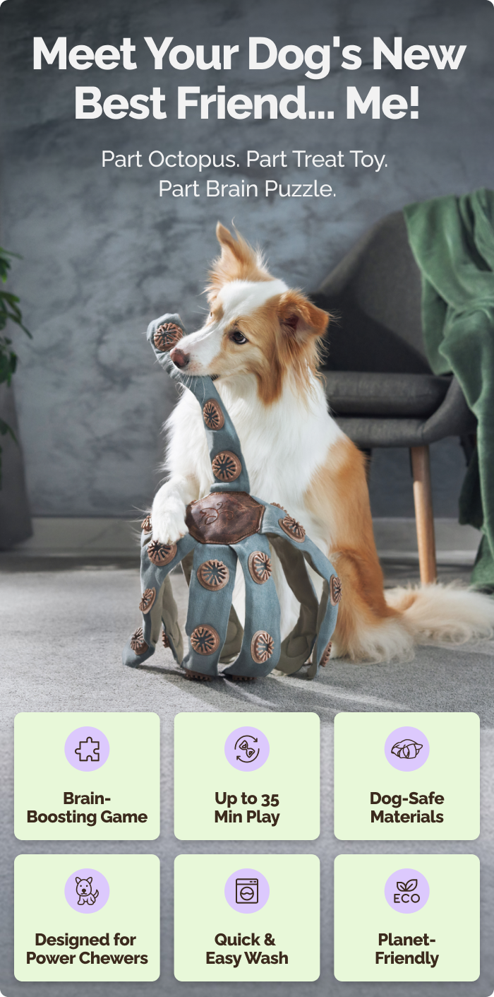 Hey friend, I’m the Dogtopus. When your dog gives you those big, bored puppy eyes, I’m here to help. I challenge their mind, reward their instincts, and keep them happy and engaged — so you can relax knowing they’re having fun the smart way.