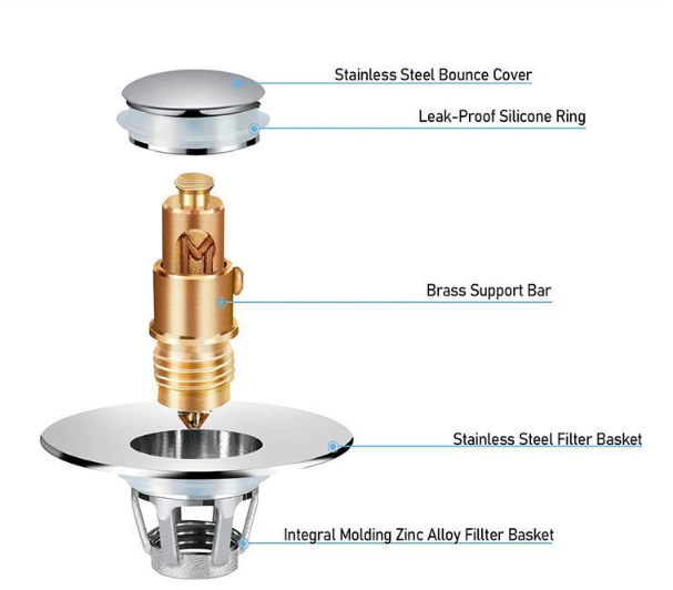 The sink plug with an anti-blocking basket strainer inside which can collect hairs and prevent the drain from clogging up, achieving effective filtering, unlike regular push button drain. Suitable for bathtub, bathroom and kitchen sink, and so on.