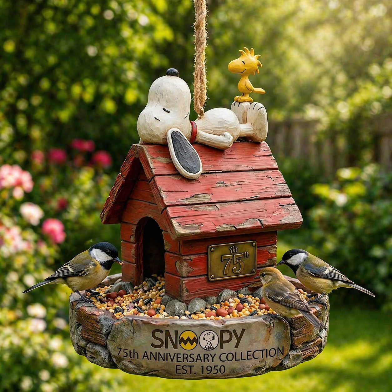 Add character and joy to your garden with this 75th Anniversary Red Doghouse Bird Feeder. Designed with a playful doghouse silhouette and charming details, it serves as both a functional bird feeder and a decorative garden accent.