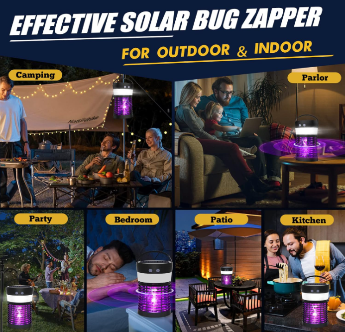 Charge conveniently with the solar panel on top by day and zaps the insects to death by night when you are on the go.When there is no sun and can't plug in, it can still be lasted by the batterys contained in equipment.