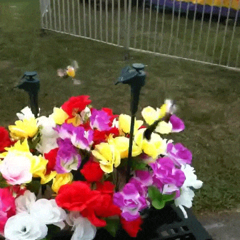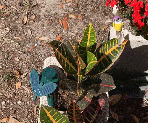 The small solar panel converts the daylight into energy for the hummingbird or butterfly and the brighter the weather the more active her flying is.