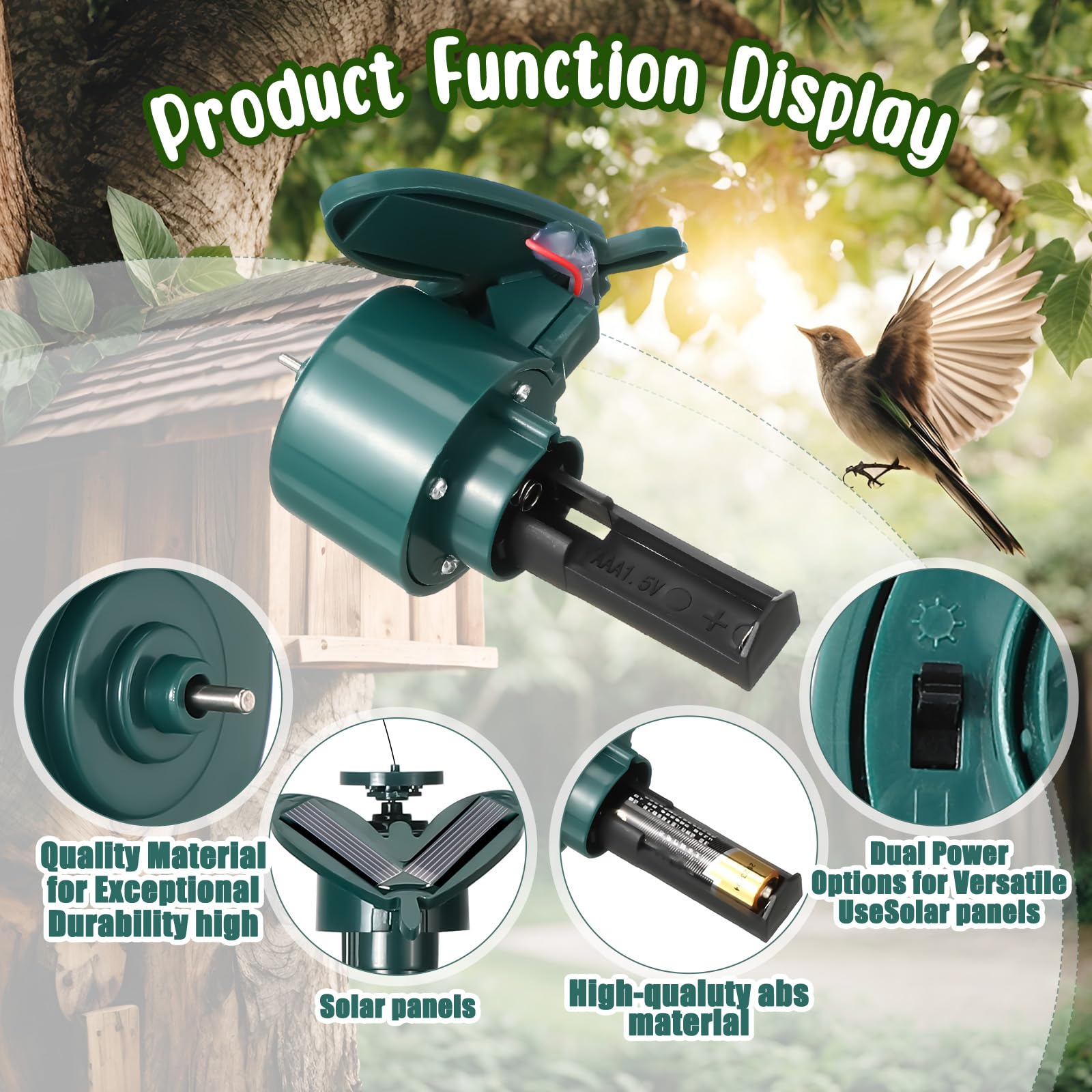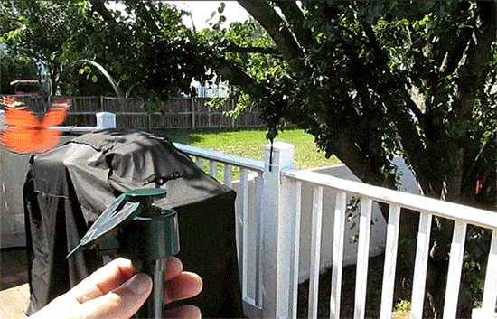 When the skies darken you can switch the energy source to the backup AAA battery for a constant flying display. Outdoors, when with sun, the hummingbird or butterfly flutters; without, it dances on the wind.