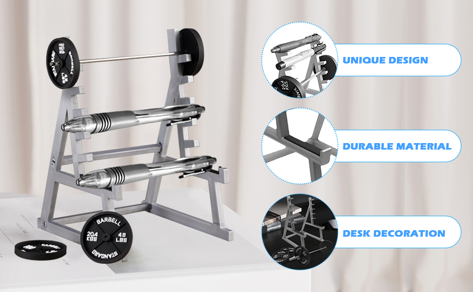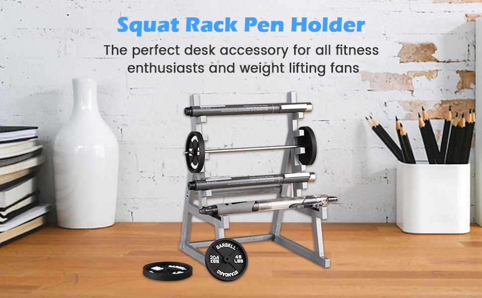 Unique Spatial Structure - This squat rack pen holder desk organizer has a appearance of a miniature squat rack with a barbell. Spacious storage space and compartment design, can make your belongings organized in an orderly manner. It's a perfect way to keep your pens, pencils, and other writing utensils organized on your desk(Up to 8 pens can be stored)