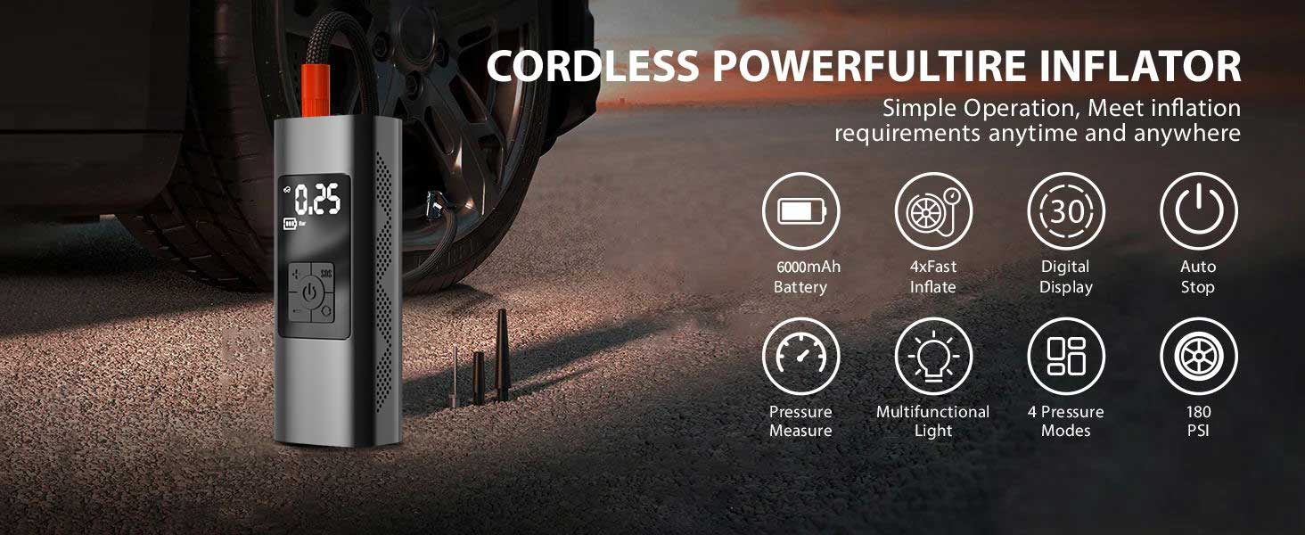 🎉【Fast, Accurate,Durable】Tire inflator comes with a built-in 10000mA rechargeable battery for power supply, eliminating the need to connect to an external power source during use. .Tire Inflator Portable Air Compressor use a newest 22-cylinder compressor,The inflation speed is four times faster than other ordinary cordless inflators , with a 50% increase in power.Accuracy ±1PSI,it can inflate 12 car tires, The cordless car tire pump makes it easy to reach all tires without a hassle.