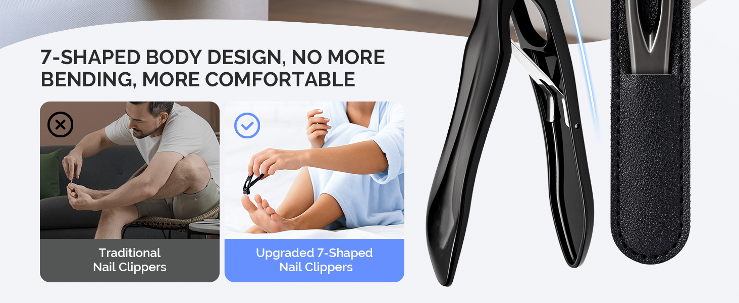 Ergonomic 7-Shape Design: Innovative bent design revolutionizes traditional nail clippers, effectively reducing back strain during use. Especially ideal for seniors, expectant mothers, individuals with back issues, and limited mobility, achieve effortless nail grooming without bending over!